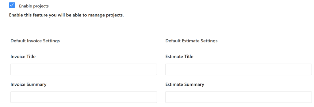 Projects are enabled by default and can be managed on the Invoice Customization page: