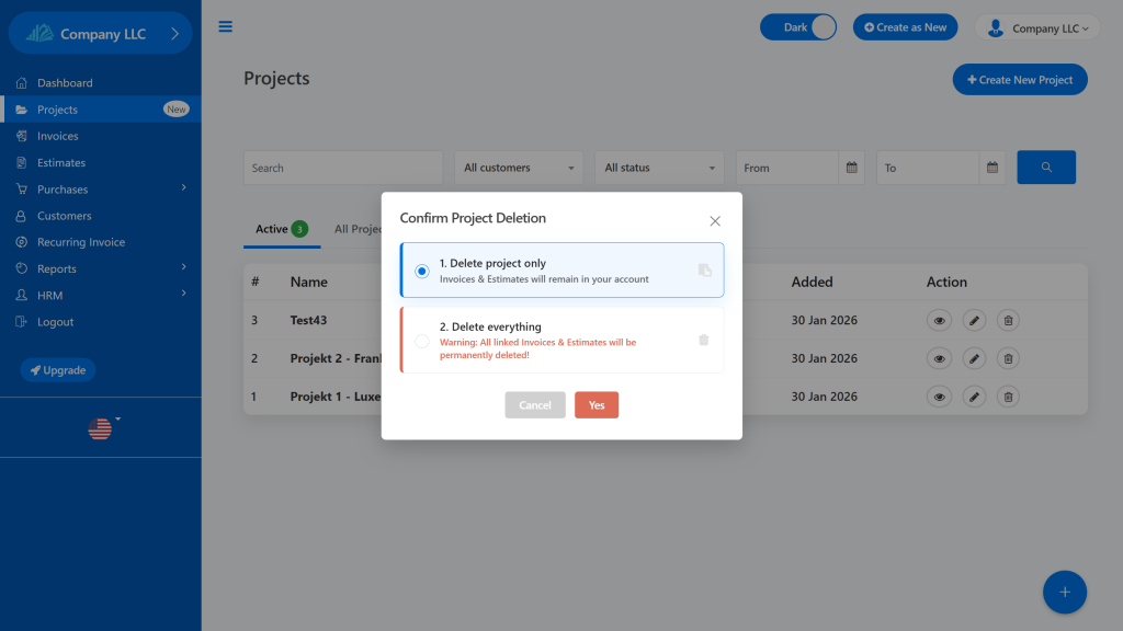 ⚠️ Warning: All linked invoices and Estimates will be permanently deleted!