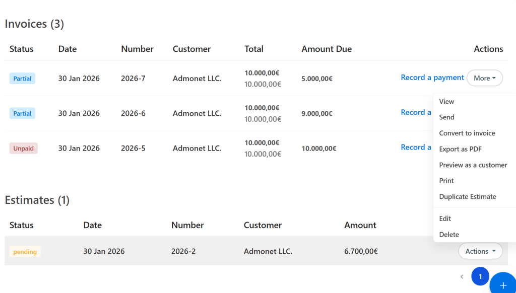 This data is automatically updated with every change (payment, new invoice, new estimate).